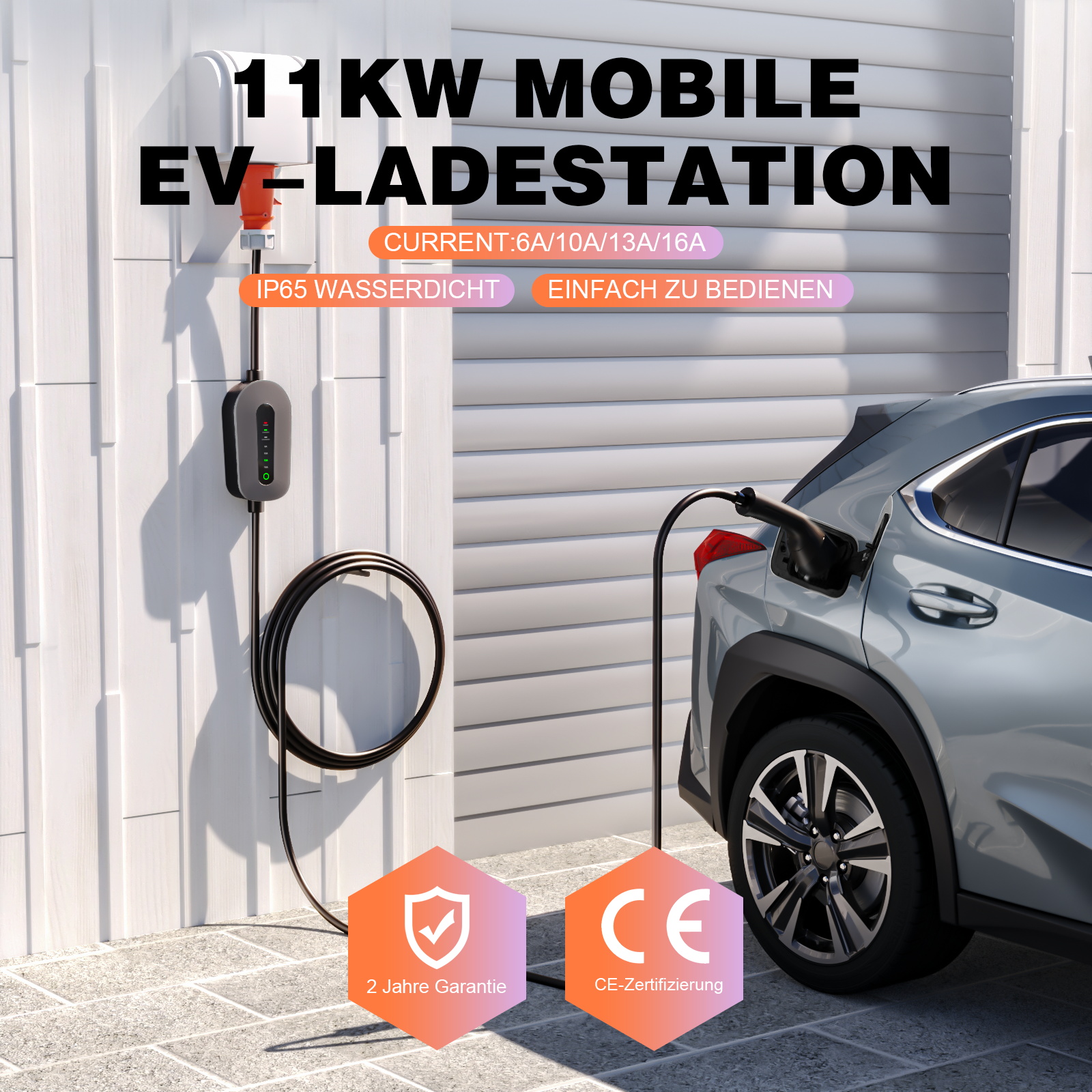 11kW EV Wallbox mit EU-Reiseadapter (CEE32/CEE16A/Schuko/Typ2 Stecker), Mobile Ladestation 3-phasig 400V (6-16A einstellbar), Typ 2 Ladekabel, für Model Y/3, ID.3/4/5, MG4, EX30, Zoe und andere PHEV/EV.