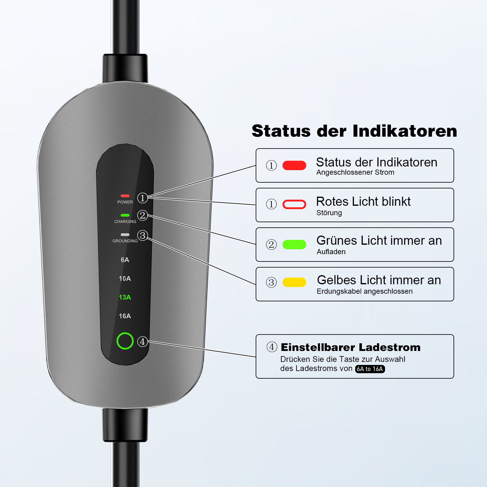 Stromstärke einstellbar (6A / 10A / 13A / 16A)