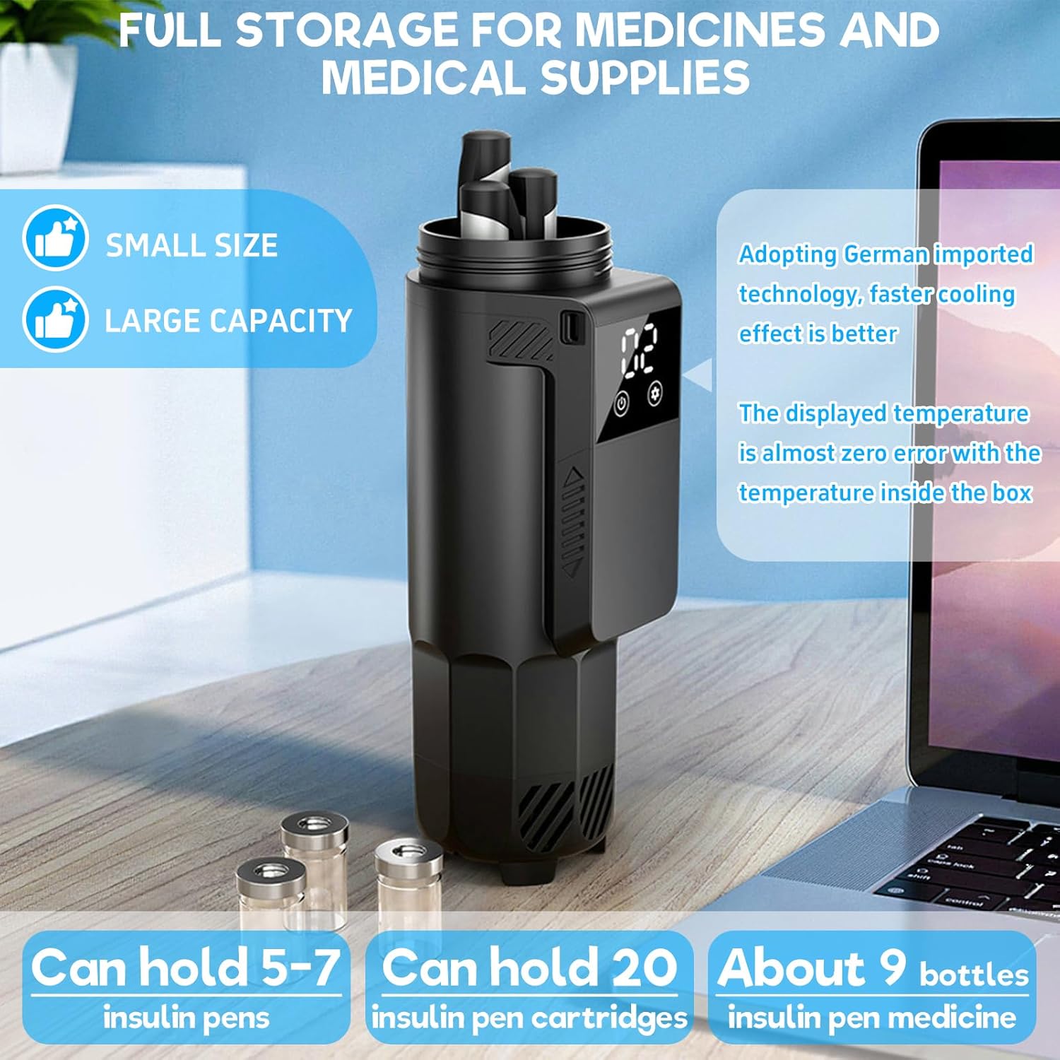 Ganz gleich, ob Sie auf einer kurzen oder langen Reise sind, diese Kühlbox hat genug Platz! Sie bietet Platz für 5-7 Insulinpens, 20 Insulinpatronen und 9 Insulinfläschchen – genug Stauraum für all Ihre Medikamente. Ideal für Diabetiker, die mehrere Insulinarten mit sich führen müssen! -