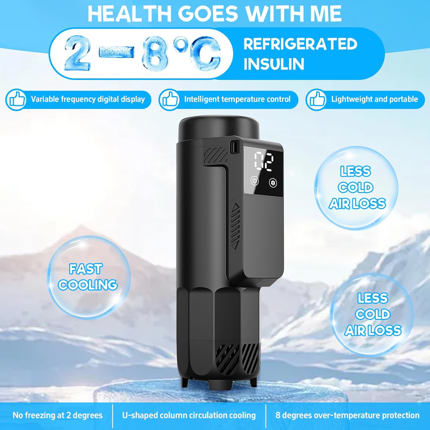 Unsere Insulin-Kühlbox sorgt dafür, dass die Temperatur konstant zwischen 0-18°C bleibt und Ihr Insulin sicher und effektiv gekühlt wird. Die Temperatur kann individuell angepasst werden, sodass Sie sie genau nach Ihren Bedürfnissen einstellen können. Die Kühlbox hält Ihr Insulin bis zu 30 Stunden auf der sicheren Temperatur – zuverlässig und mit hervorragender Kühlleistung. -