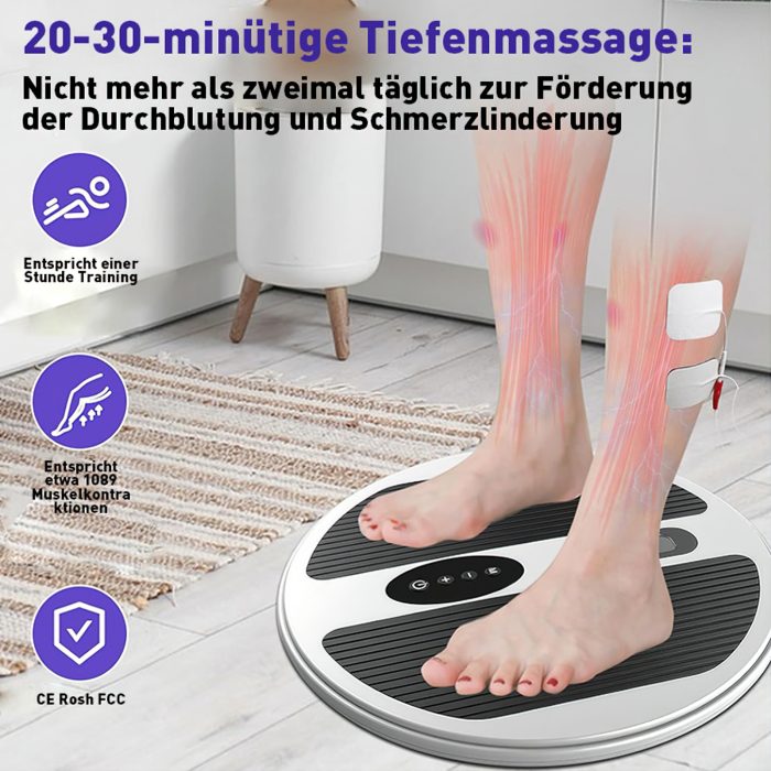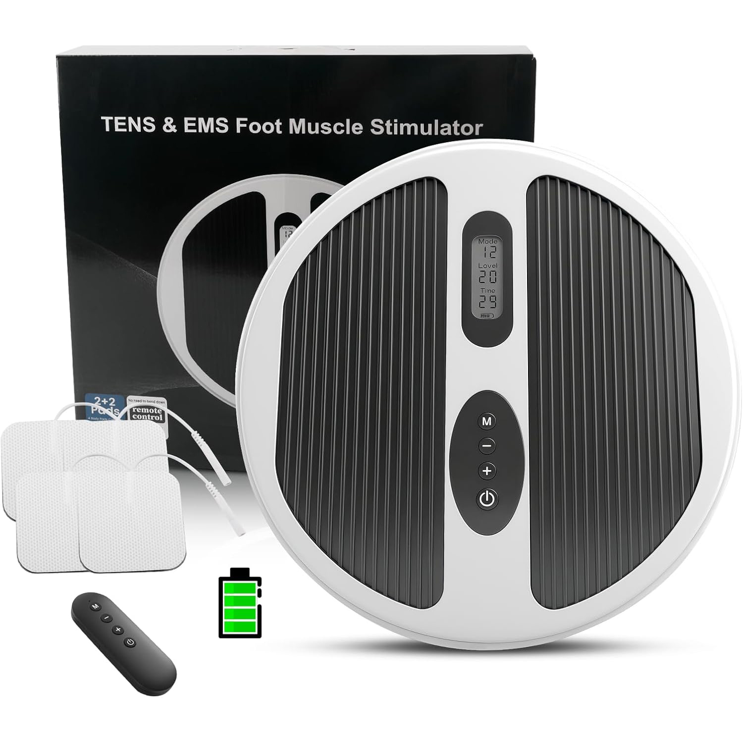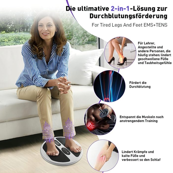 Dieses Fußmassagegerät nutzt die fortschrittliche EMS (Elektrische Muskelstimulation) und TENS (Transkutane Elektrische Nervenstimulation)-Technologie. Es verwendet niederfrequente elektrische Ströme, um Schmerzen zu lindern, die Blutzirkulation zu fördern und die Muskeln zu stimulieren, alles bequem zu Hause.