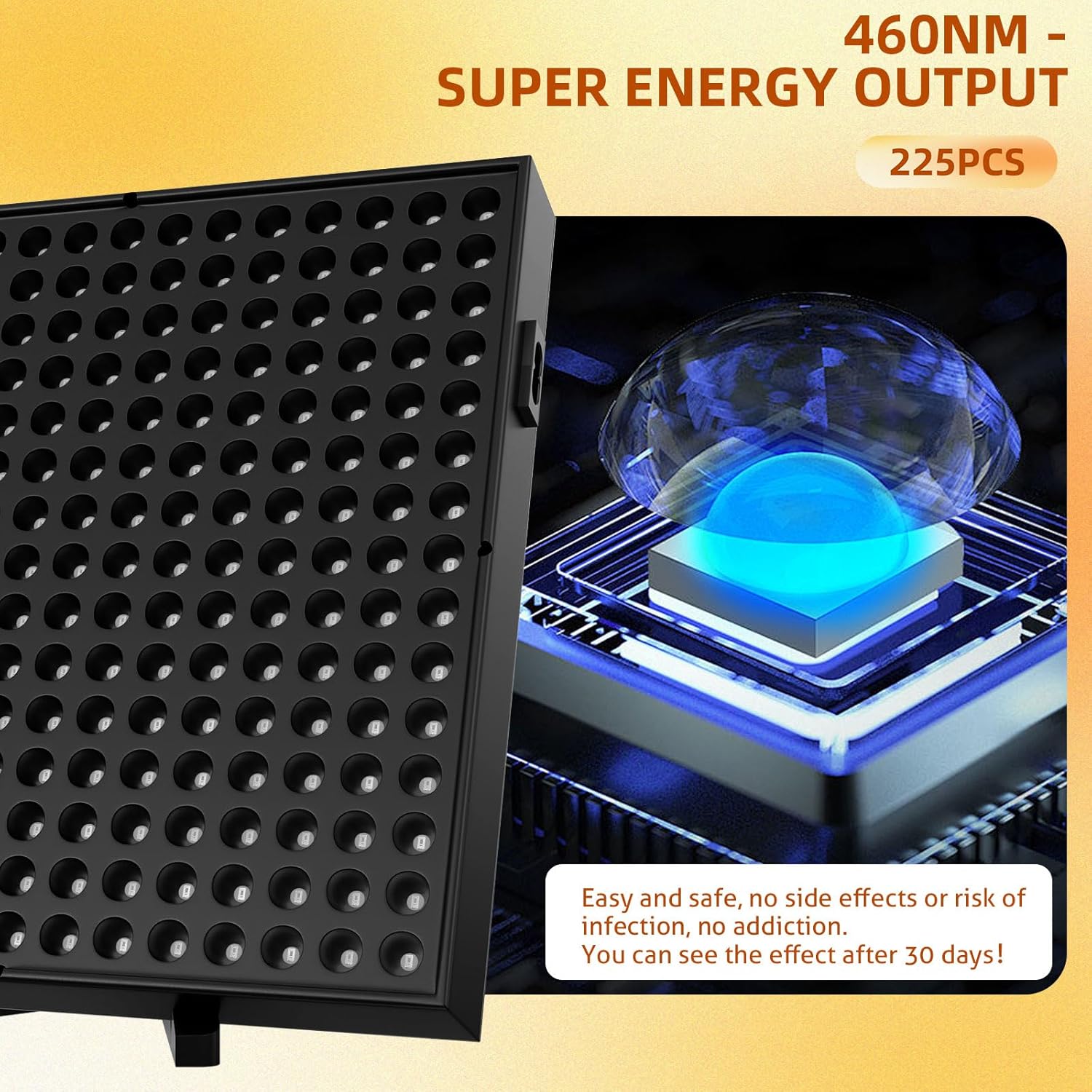 Diese Bräunungsplatte simuliert das Sonnenlicht und ist mit 225 fortschrittlichen 460 nm LED-Chips ausgestattet, die eine hohe Leistung von bis zu 45 Watt bieten. Sie sorgt für eine gleichmäßige und kontinuierliche Bestrahlung von Gesicht und Körper, die tief in die Haut eindringt und die Melaninproduktion anregt – für eine gleichmäßige und langanhaltende Bräune. (Hinweis: Bitte tragen Sie vor der Anwendung Schutzbrillen, um Ihre Augen zu schützen.)