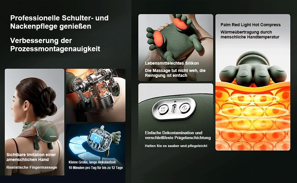 Dieses Nacken- und Schultermassagegerät verwendet Akupressurtechnik und bietet eine 4D Knetmassage, um die Muskelverspannungen im Nacken und in den Schultern zu lösen und Ihnen ein angenehmes Massageerlebnis zu bieten.