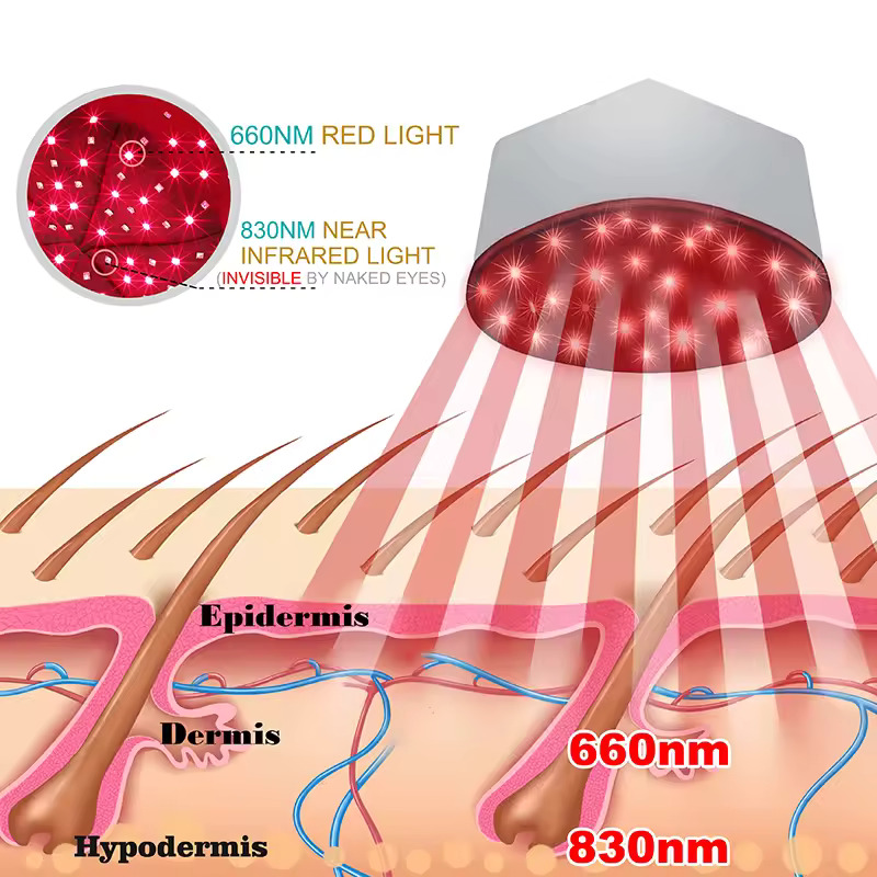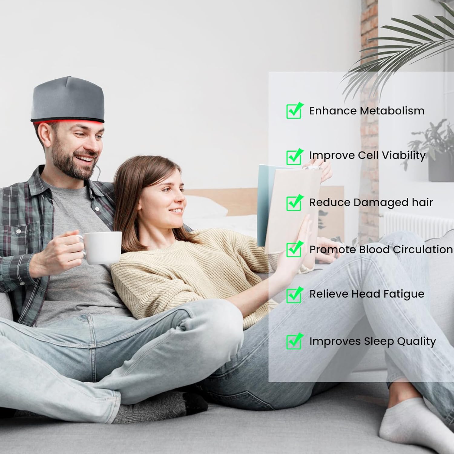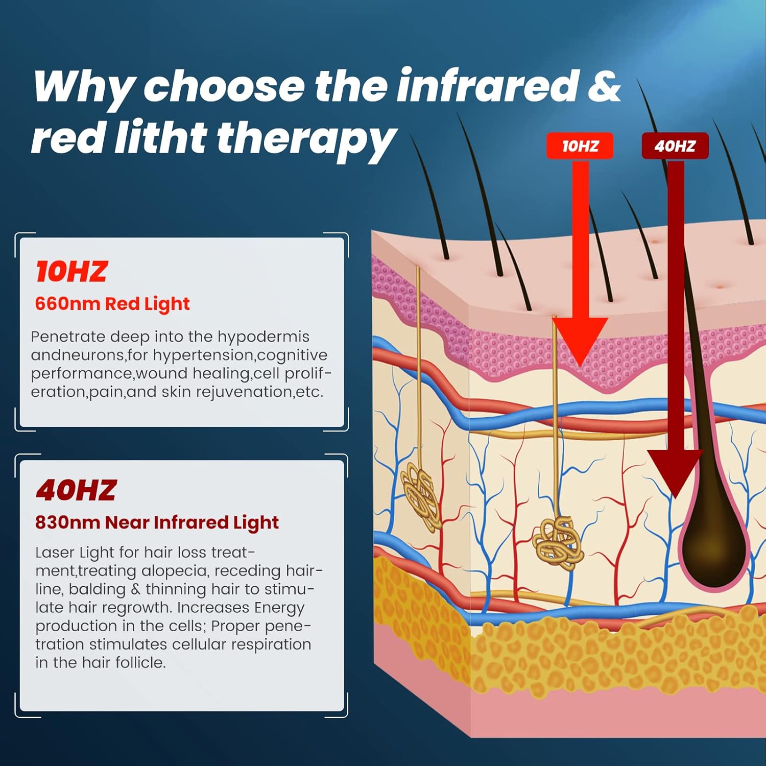 Ausgestattet mit Dual-Wellenlängen-Technologie verfügt die Kappe über 660 nm rote LED-Lichter und 830 nm infrarote LED-Lichter, die tief in die Kopfhaut eindringen, um die Durchblutung zu verbessern, Entzündungen zu reduzieren und die zelluläre Regeneration der Haarfollikel zu unterstützen.