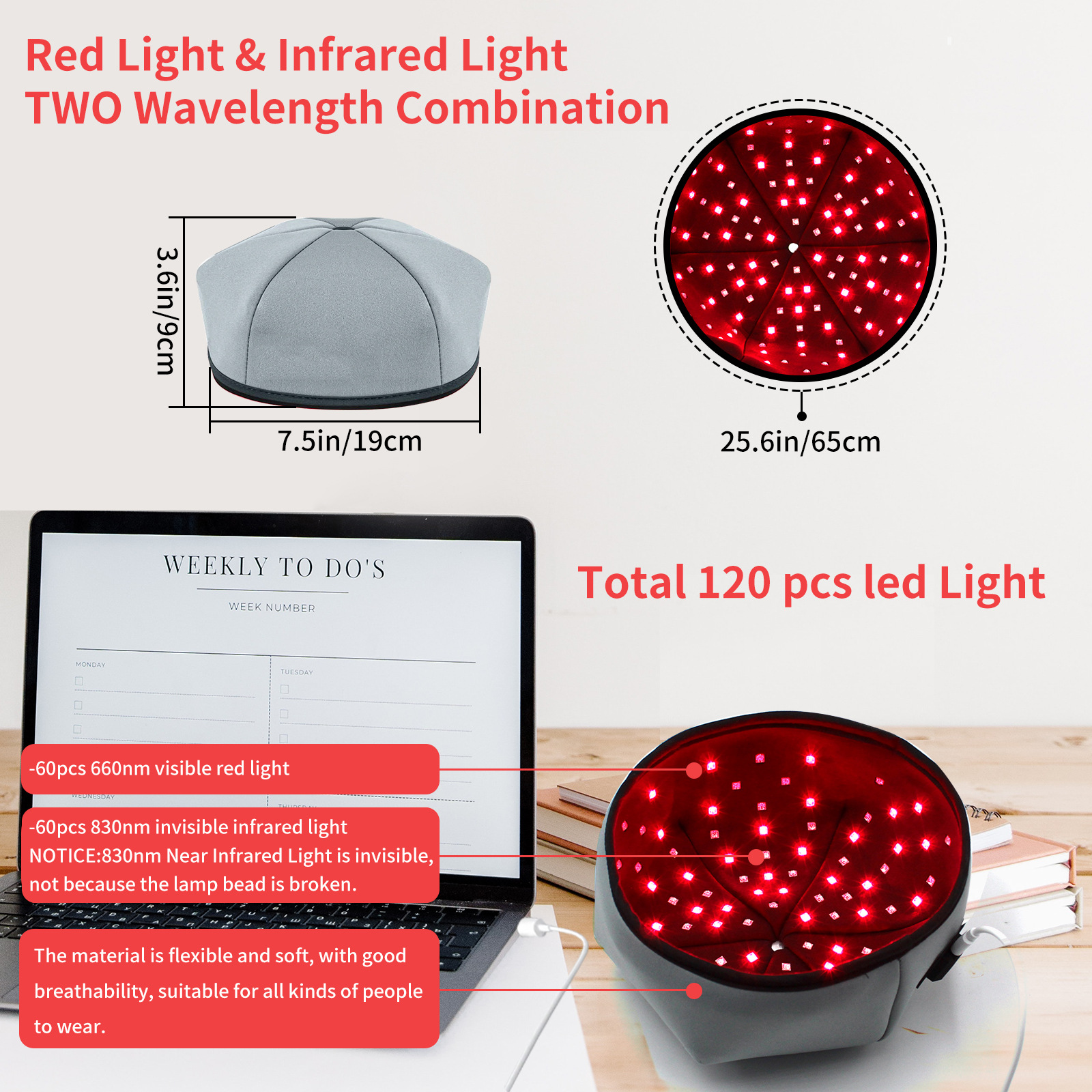 Kombiniert 660 nm rotes LED-Licht und 830 nm nahinfrarotes LED-Licht für optimale Eindringtiefe in die Kopfhaut. Die Kappe enthält 60 rote LEDs (670 nm) und 60 infrarote LEDs (830 nm) – insgesamt 120 hochwirksame therapeutische Lichtquellen.