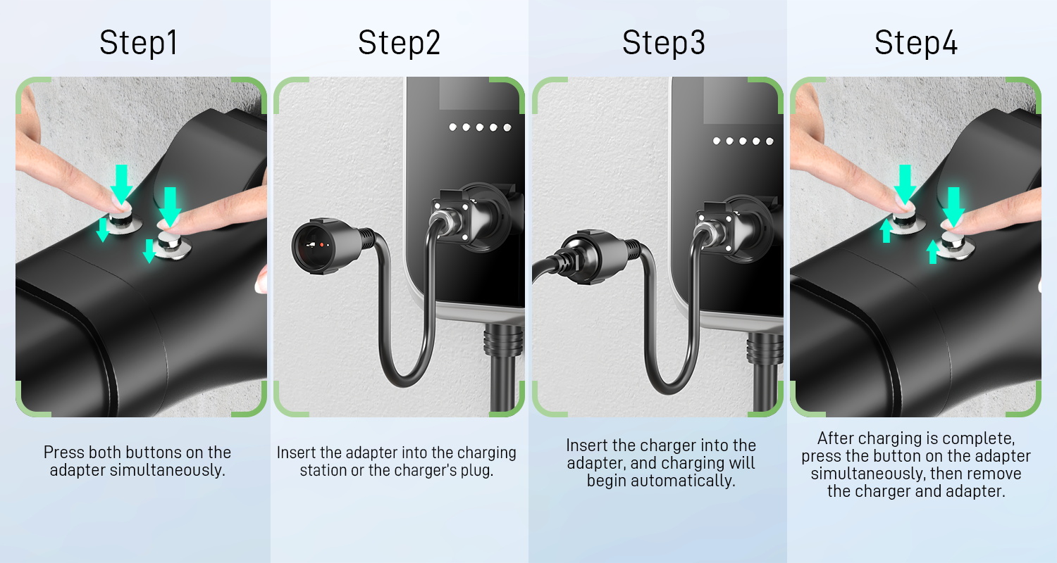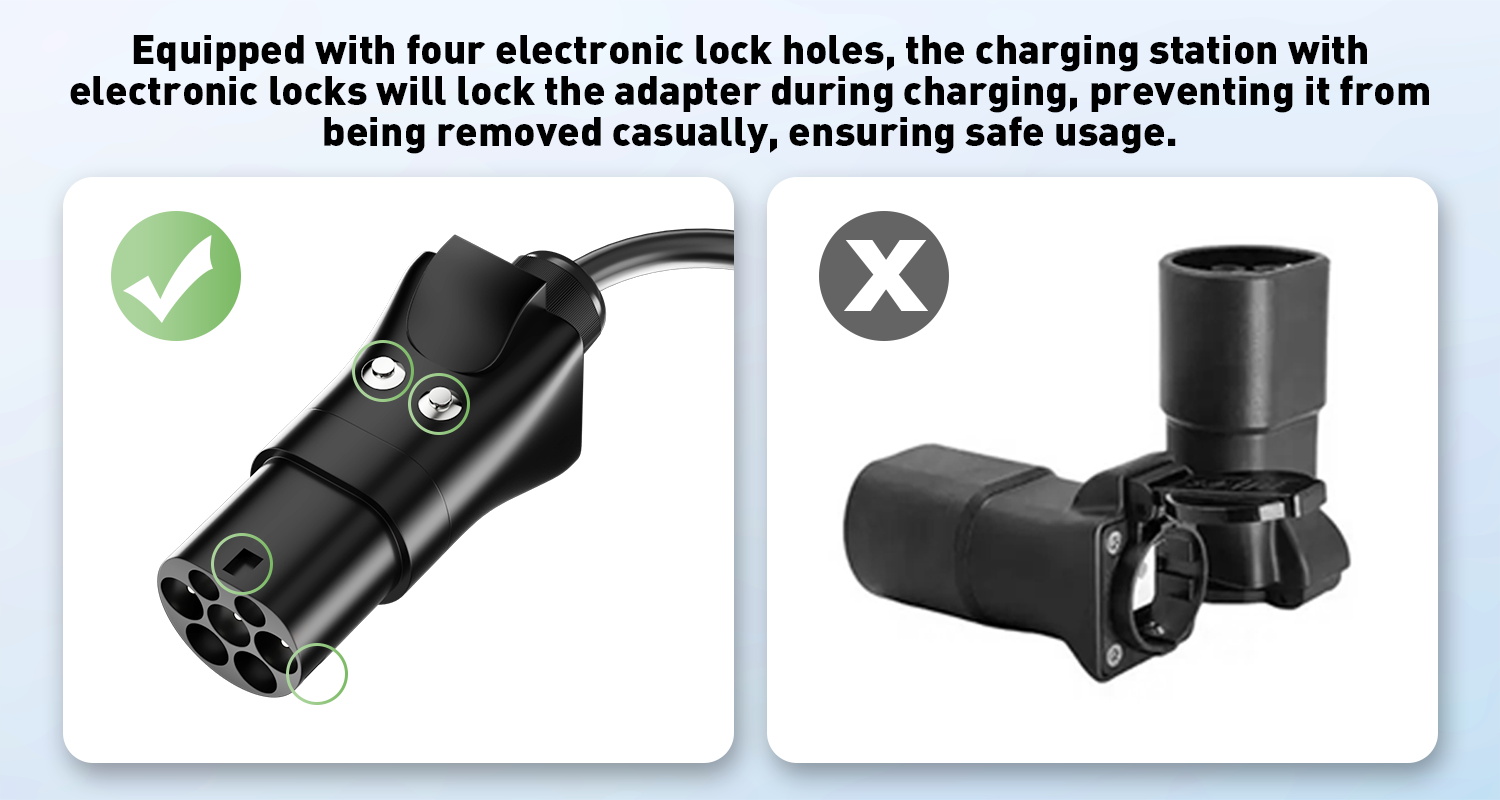 Der Adapter verwendet einen Stecker mit vier Verriegelungslöchern und entspricht den IEC- und CE-Normen. Sofern die Ladestation über eine elektronische Verriegelung verfügt, wird der Adapter während des Ladevorgangs automatisch gesperrt, um ein unbeabsichtigtes Abziehen zu verhindern und die Sicherheit beim Laden zu maximieren.