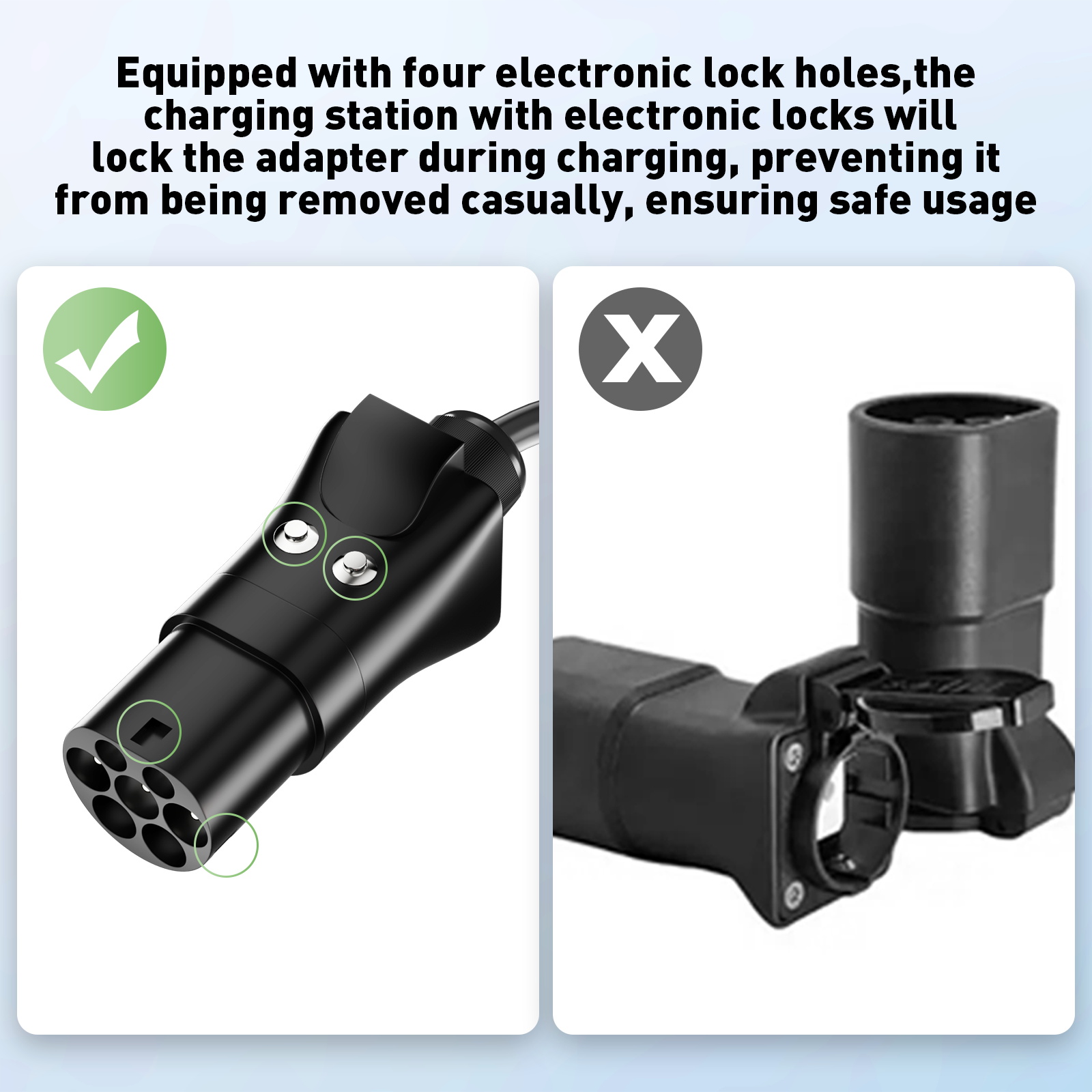 Der Adapter verwendet einen Stecker mit vier Verriegelungslöchern und entspricht den IEC- und CE-Normen. Sofern die Ladestation über eine elektronische Verriegelung verfügt, wird der Adapter während des Ladevorgangs automatisch gesperrt, um ein unbeabsichtigtes Abziehen zu verhindern und die Sicherheit beim Laden zu maximieren.